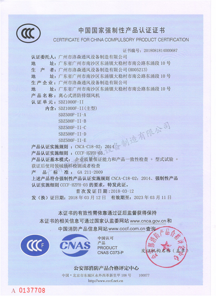 • CCCF證書-洛森風(fēng)機(jī)180314離心式消防排煙風(fēng)機(jī)SDZ1000F-II(SDZ1000F-II~SDZ500F-II-E)